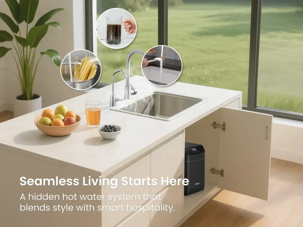 This is more than just a faucet; it’s the efficiency engine for your coffee bar. Our commercial-grade instant hot water system is installed under-sink, delivering instant, stable, and precise hot water through an elegant tap.
